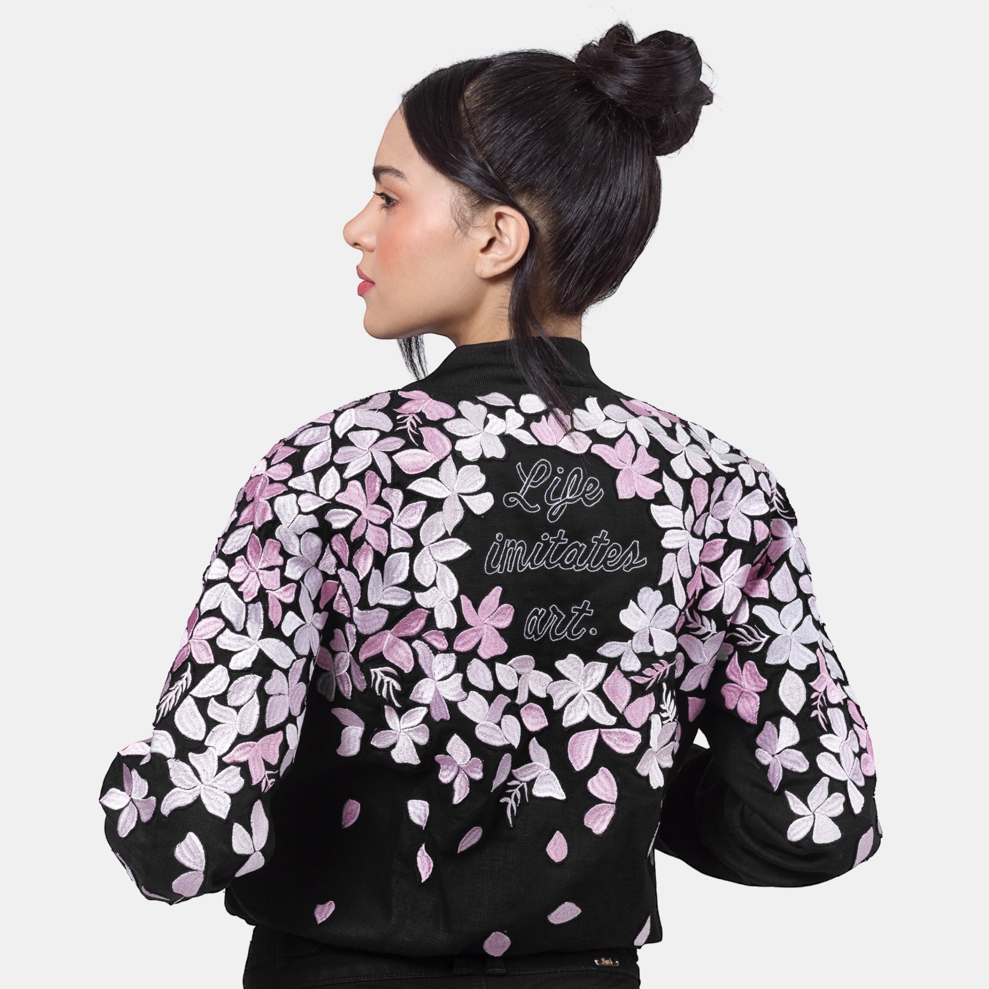 Hand-embroidered garment with petal applications inspired by cherry trees. Each petal is carefully embroidered by hand. No jacket is identical to another, since the non-standardized artisan process allows each piece to have its own essence.