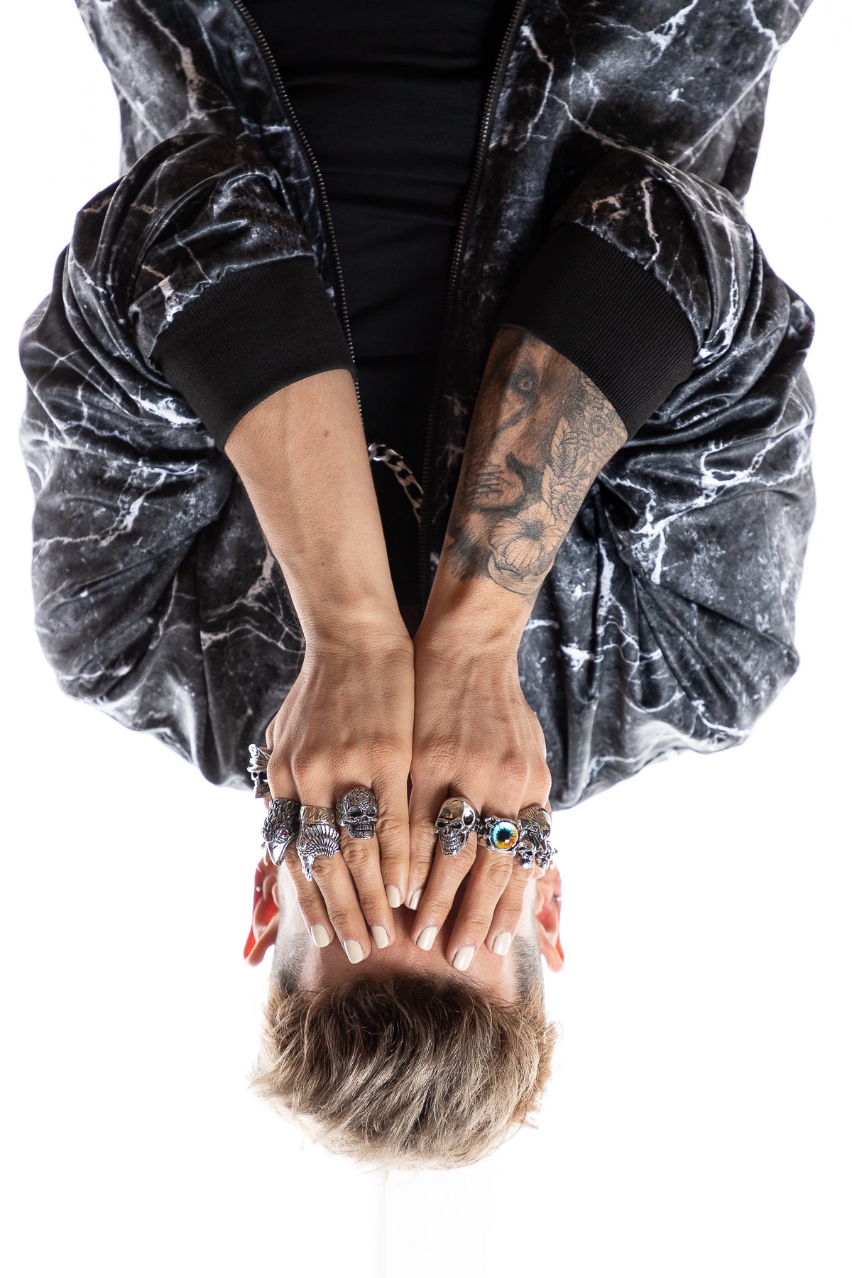 Bomber Jacket inspired by the texture of black marble. Printed on satin textile with sporty openwork interior. The garment is comfortable and very soft to the touch, fresh to be worn all year round.