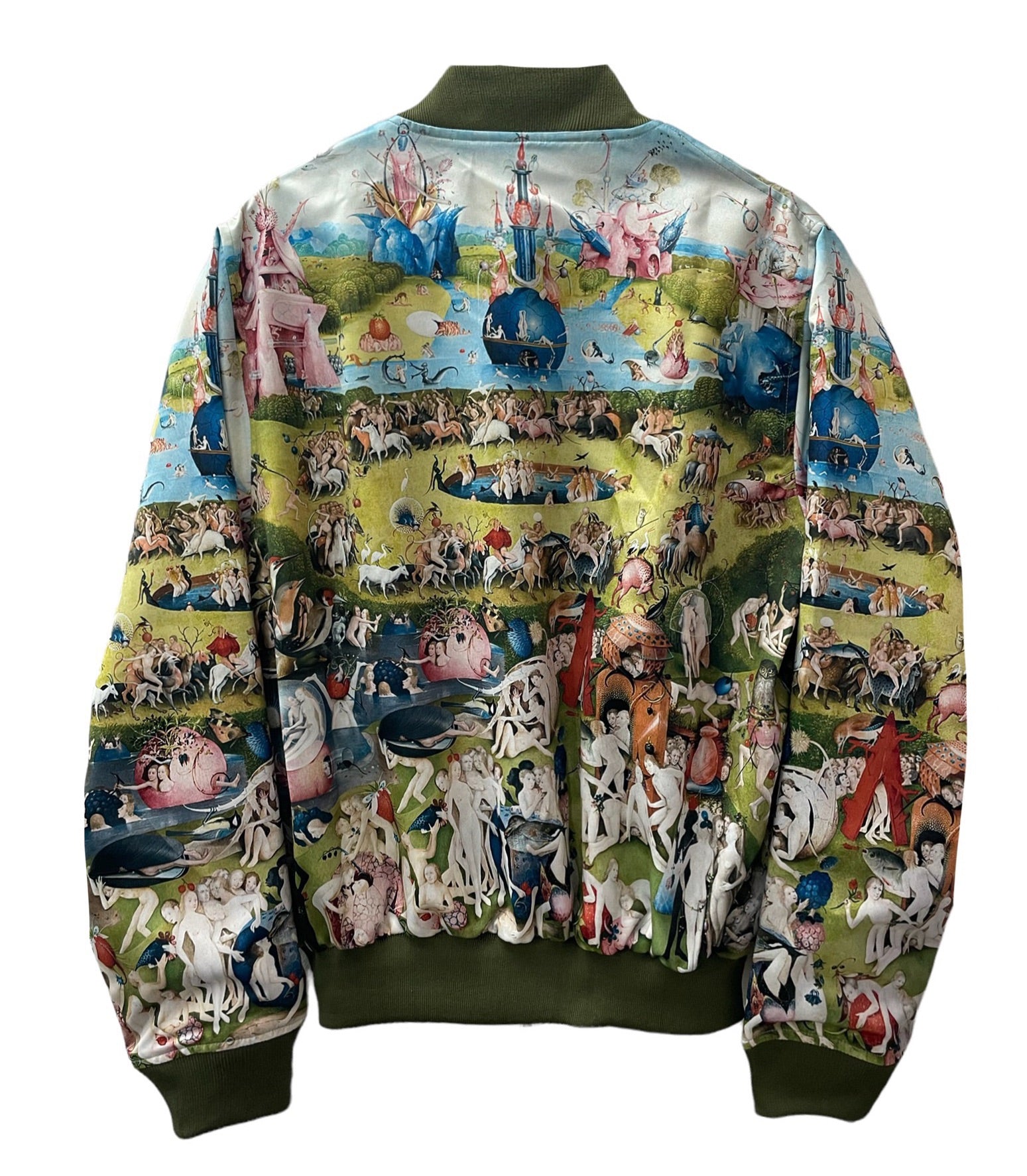 Bomber Jacket imprimé sur polyester, adaptation du Jardin des délices, par Bosco.