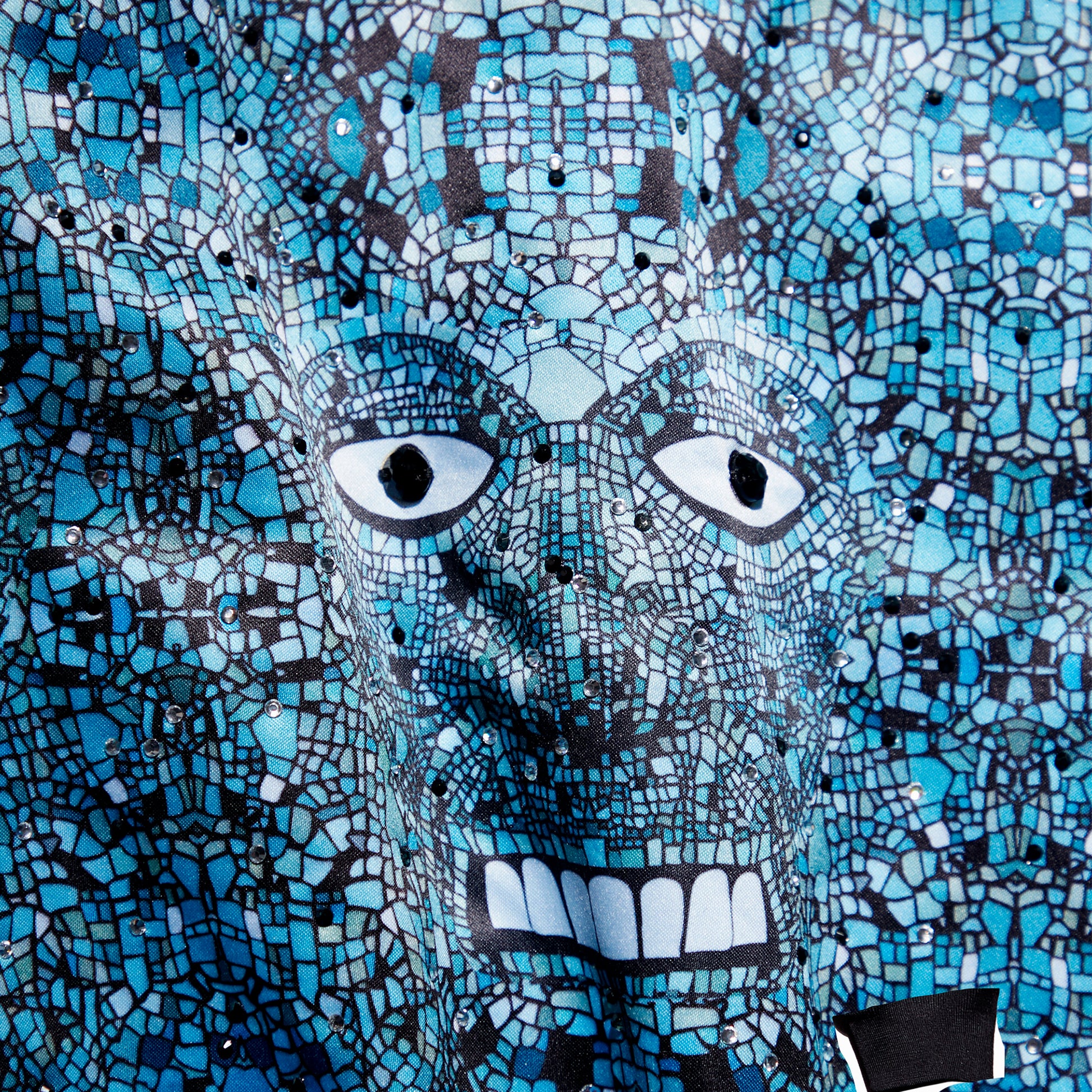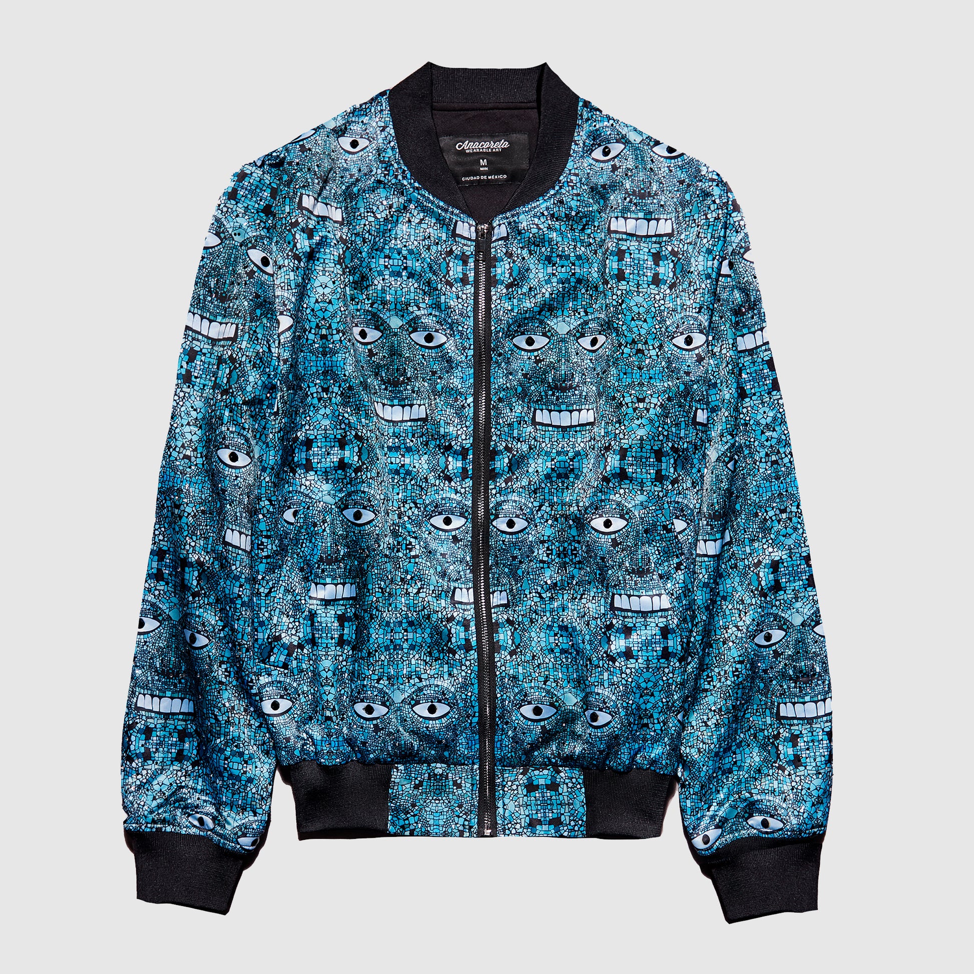 Bomber Jacket inspirada en las máscaras prehispanicas de jade. Combinación de pedrería bordada a mano y aplicaciones de cristales de calidad premium.