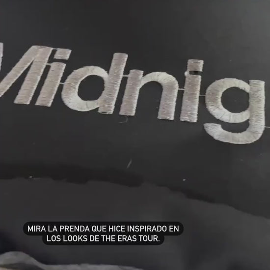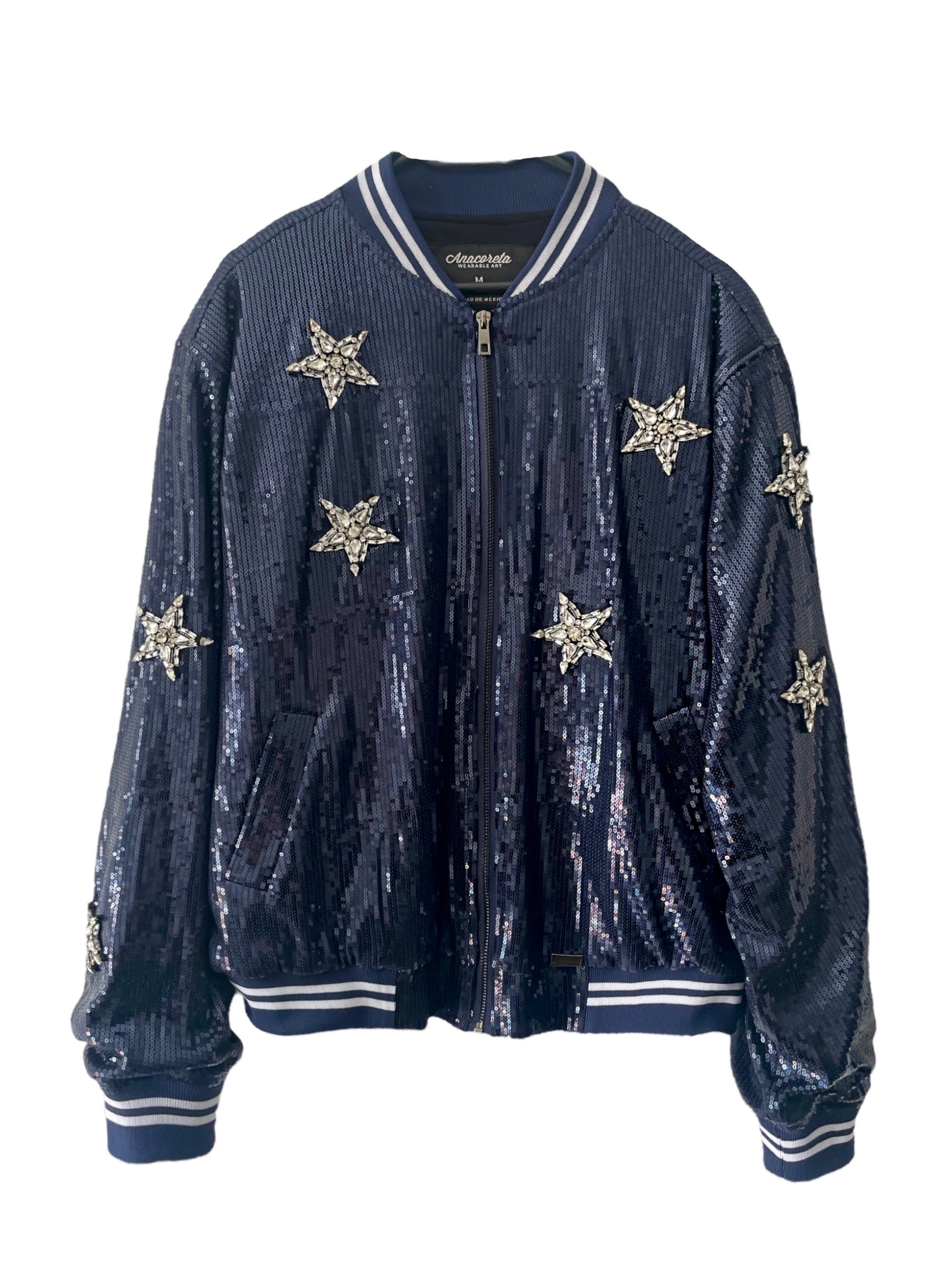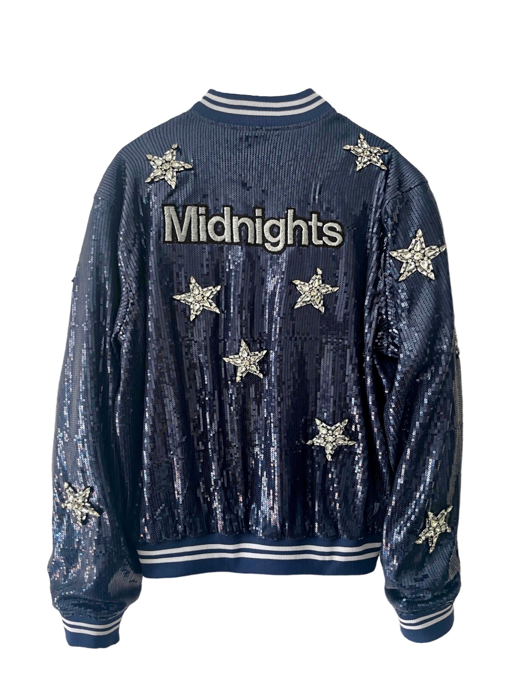 Bomber Jacket de lentejuelas azul marino inspirados en Midnights de TS. Las estrellas son de cristal cortado que se borda cuidadosamente.