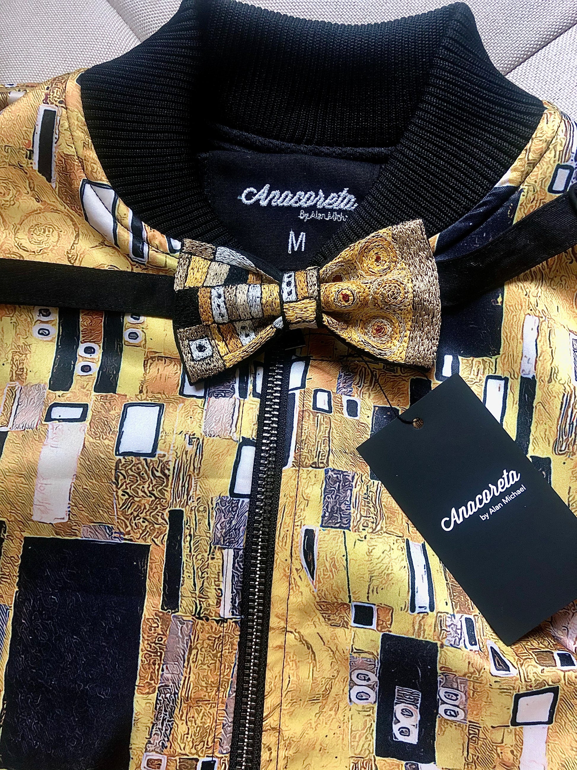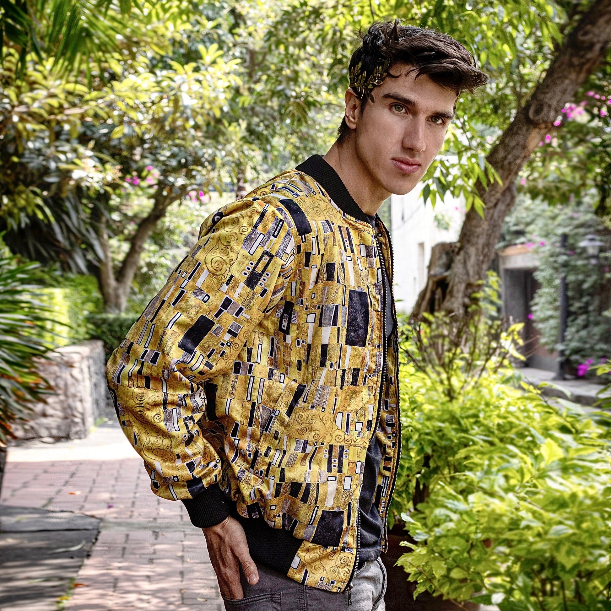 Bomber Jacket inspiré de l'oeuvre "Le Baiser" de Gustav Klimt. Nous avons deux versions disponibles en impression seule ou en impression + broderie à la main avec des applications de verre taillé.