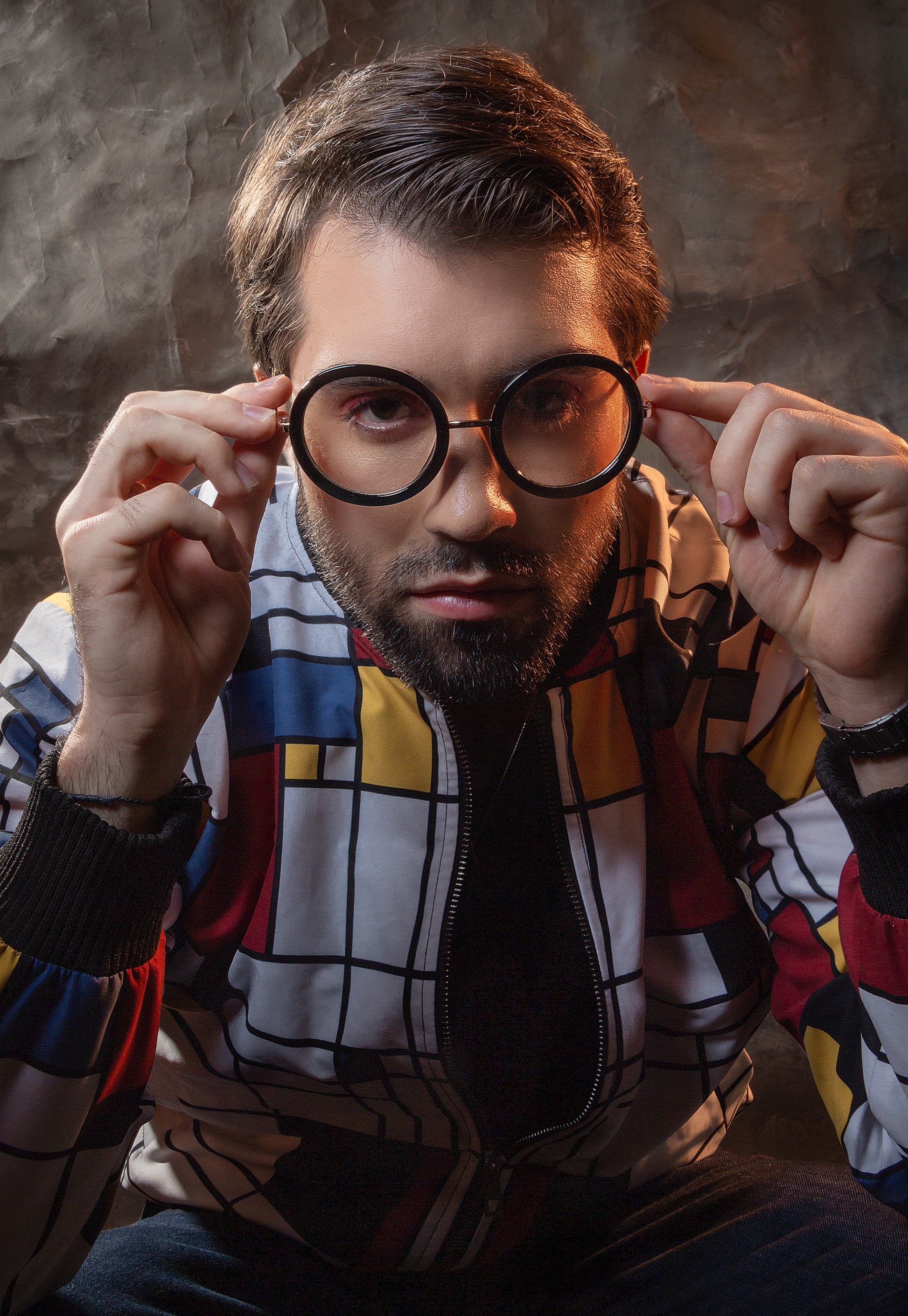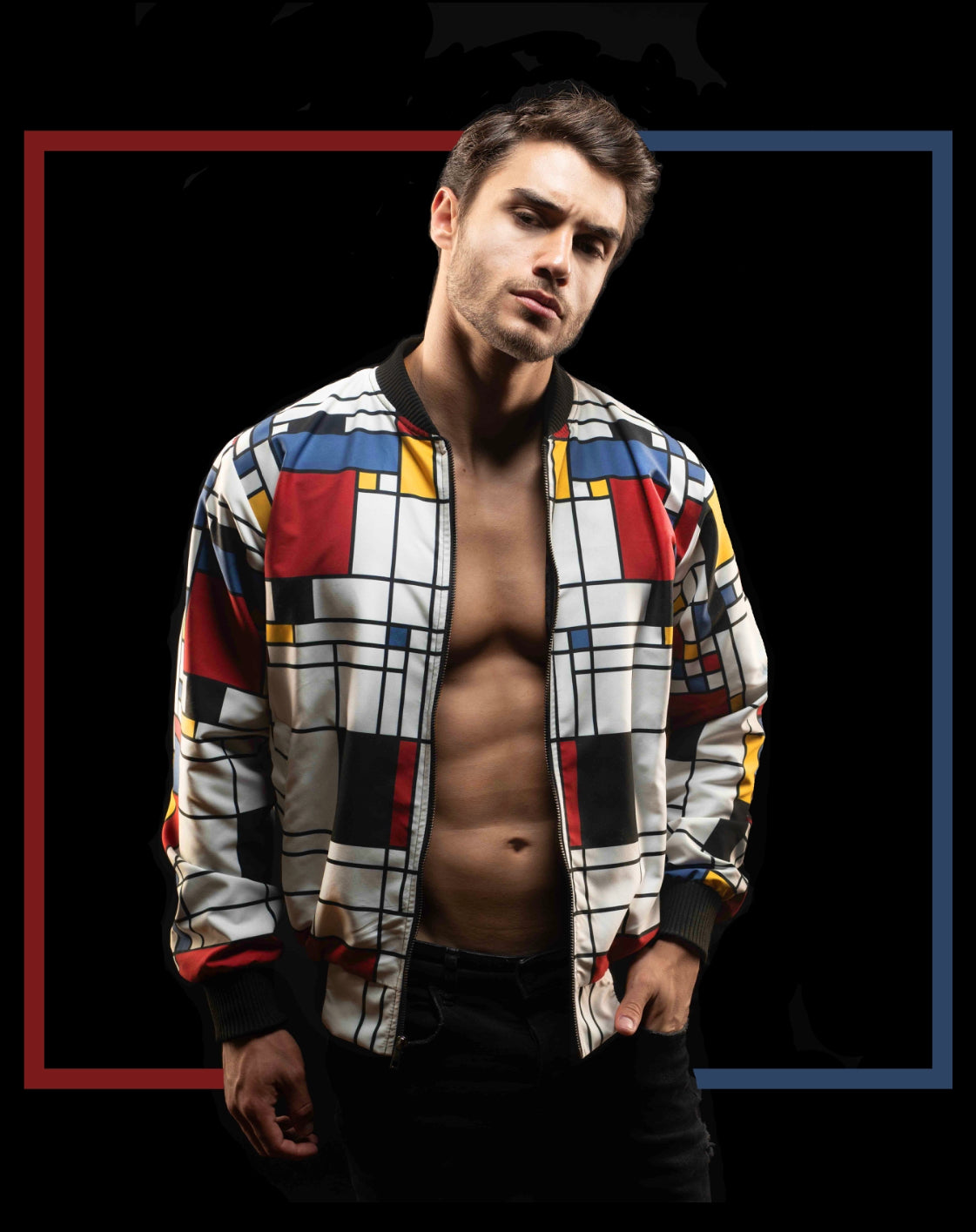 Blouson aviateur imprimé sur polyester, inspiré de Piet Mondrian et du mouvement Bauhaus.