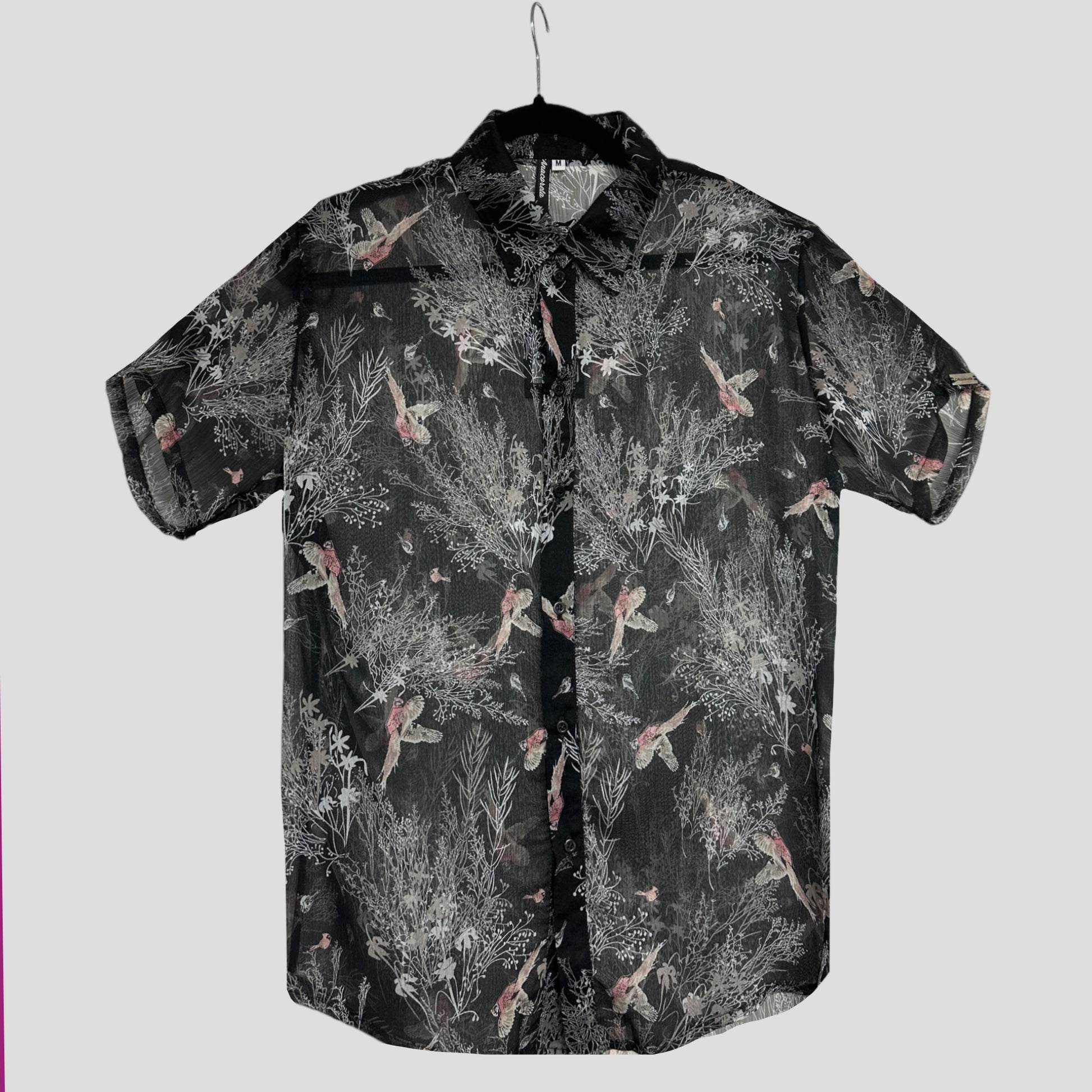 Camisa estampada con motivos de la naturaleza. Tejido tipo gasa semi-transparente.