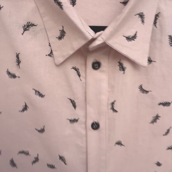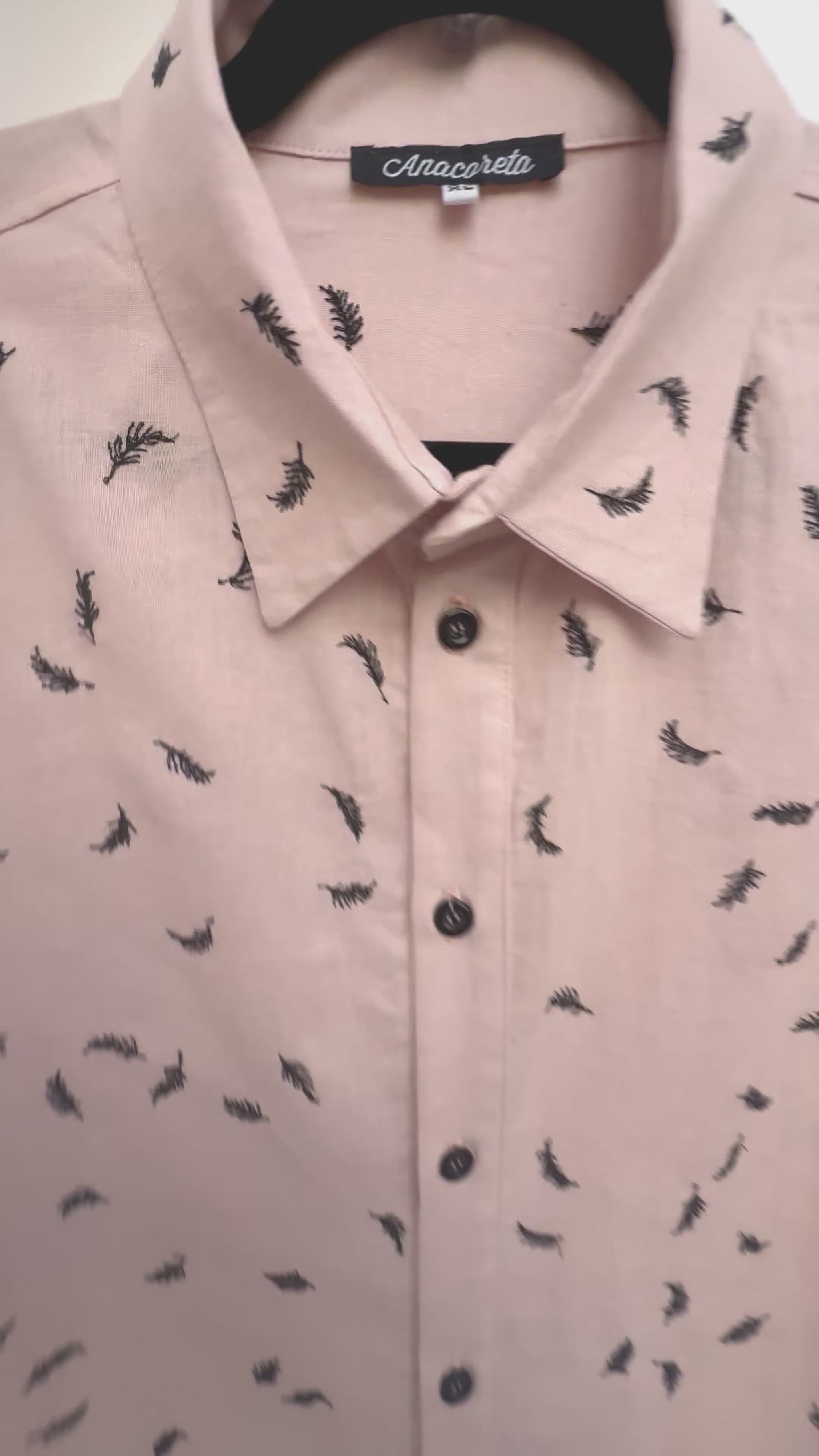 Camisa de lino/algodón bordada a mano con motivos de plumas de ave. Cada pluma se hace a mano sobre el lienzo, dando como resultado una prenda única cuyos motivos no se repiten jamás.