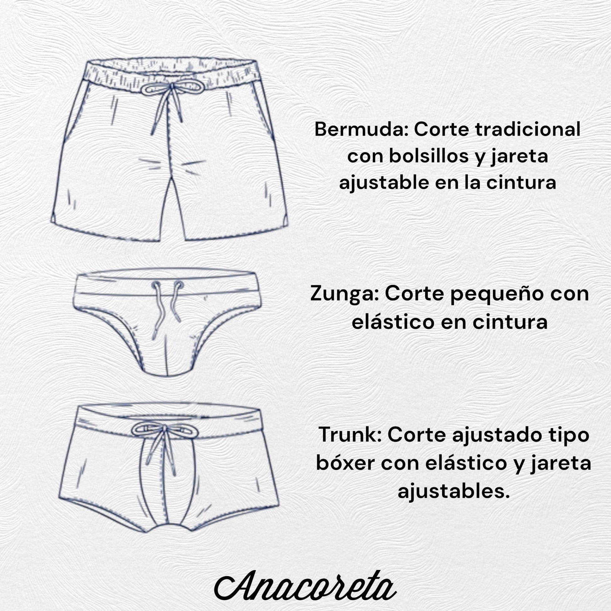 Tenemos 3 tipos de corte: bermuda (con bolsas) tipo trunk que se ajusta al cuerpo y también corte tipo zunga.
