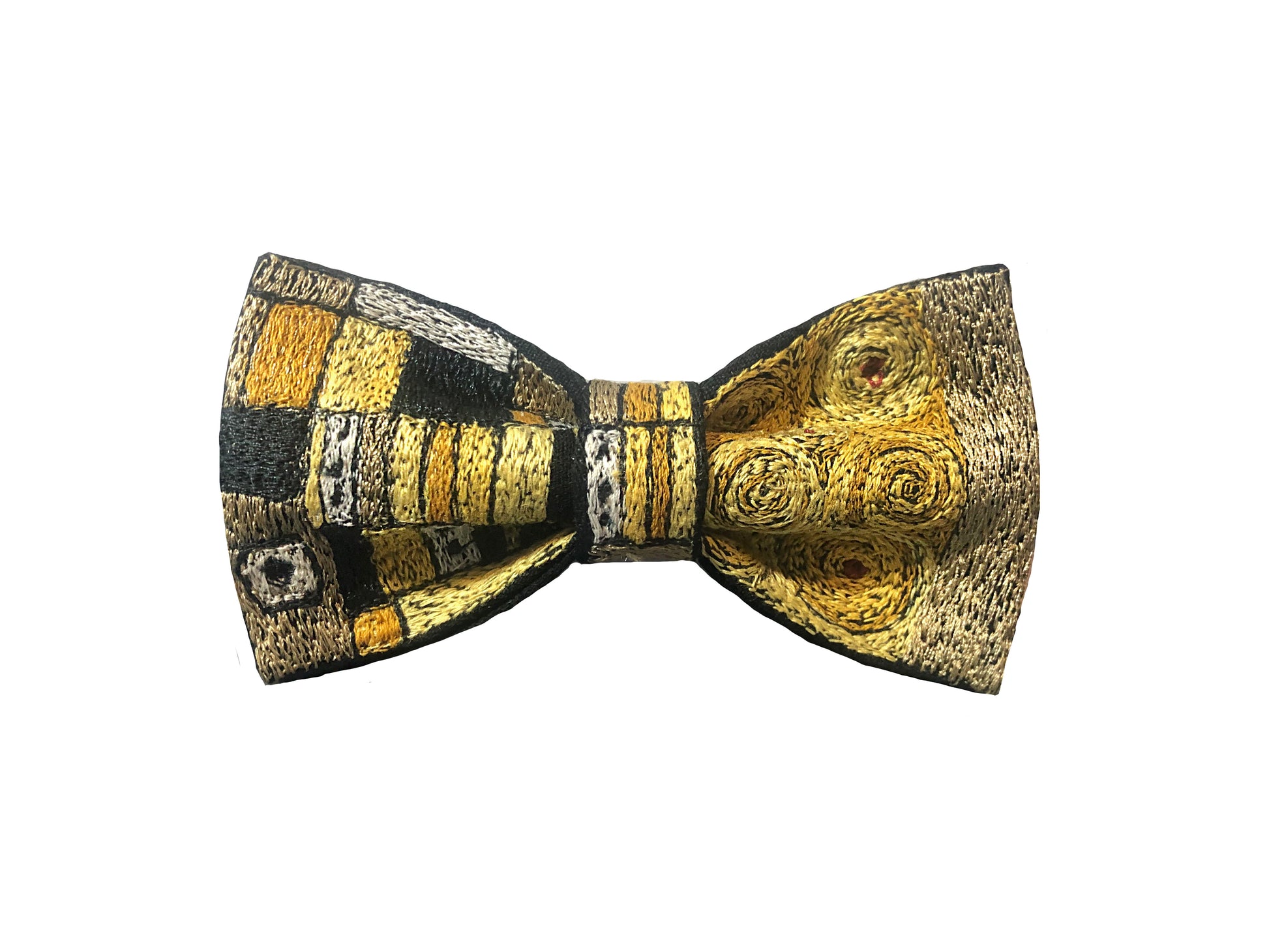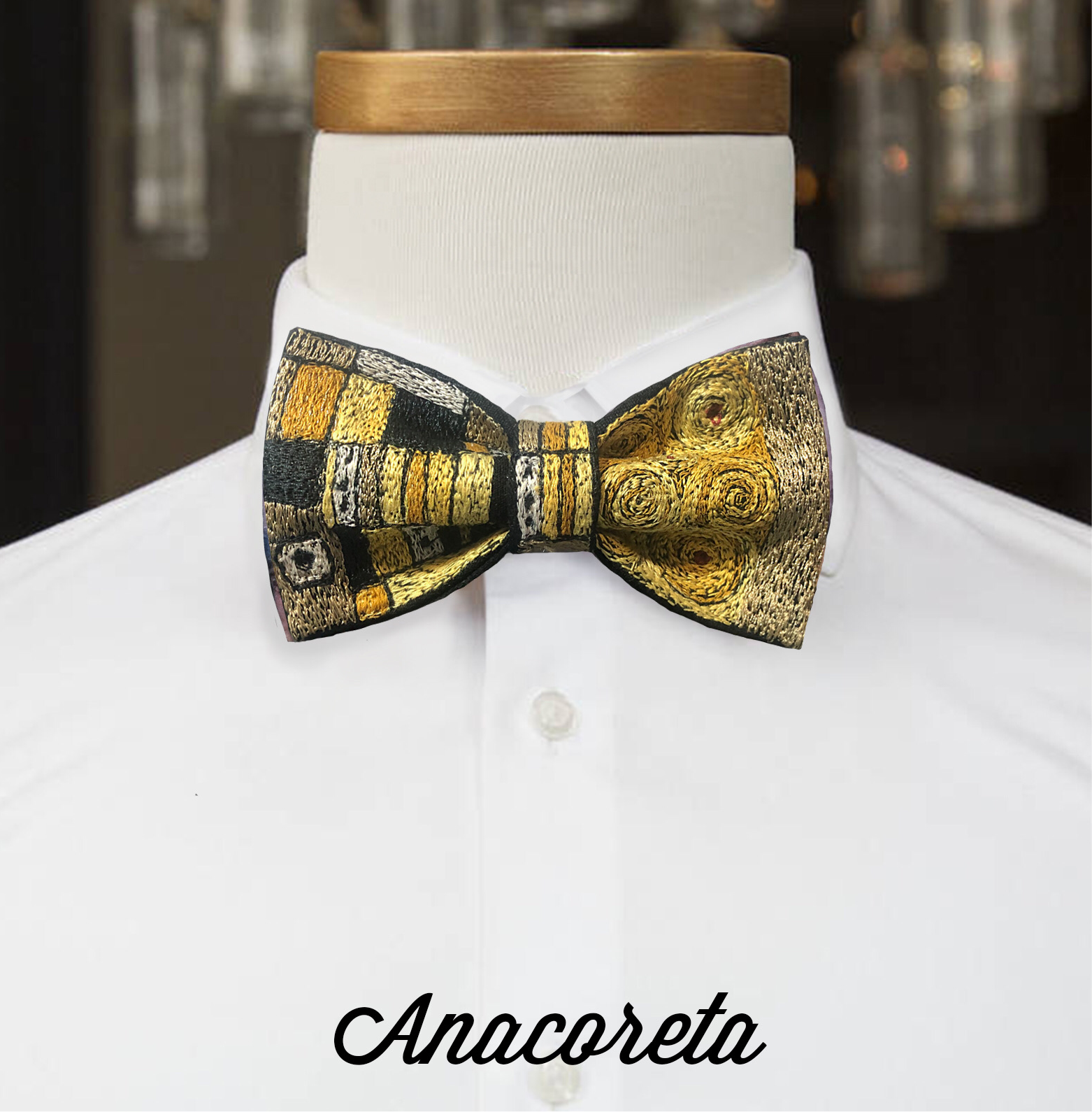 Corbatín bordado completamente a mano con hilo de algodón y dorado, con motivos inspirados en “El beso” de Gustav Klimt.