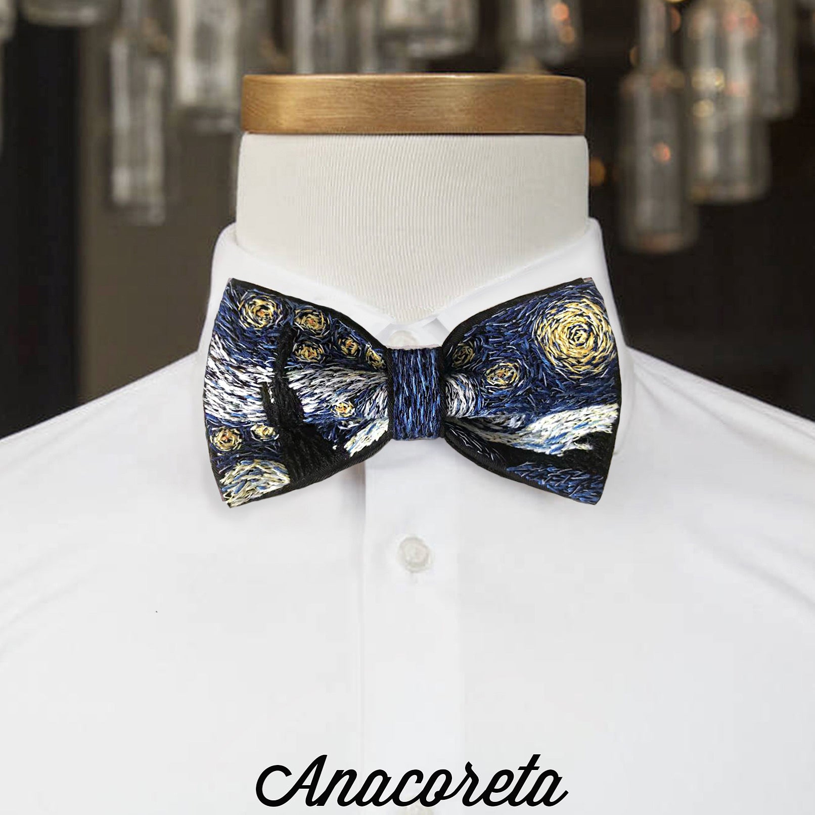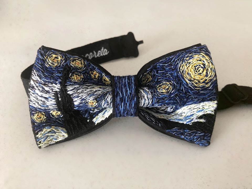 Bowtie completamente bordado a mano inspirado en La noche estrellada de Van Gogh. Corbatín (bowtie) bordado a mano. Creado por manos mexicanas con mucha dedicación y amor por el detalle.