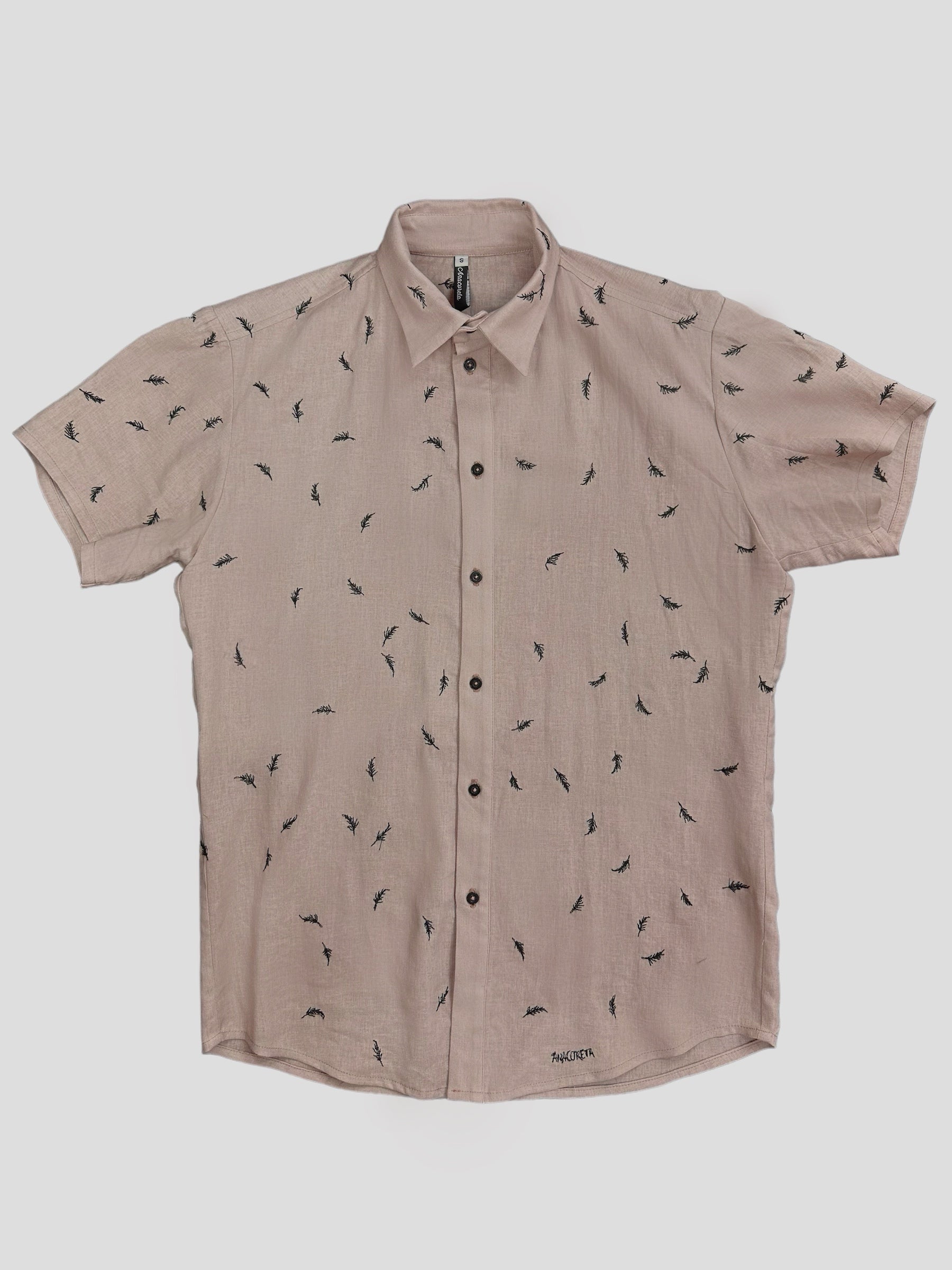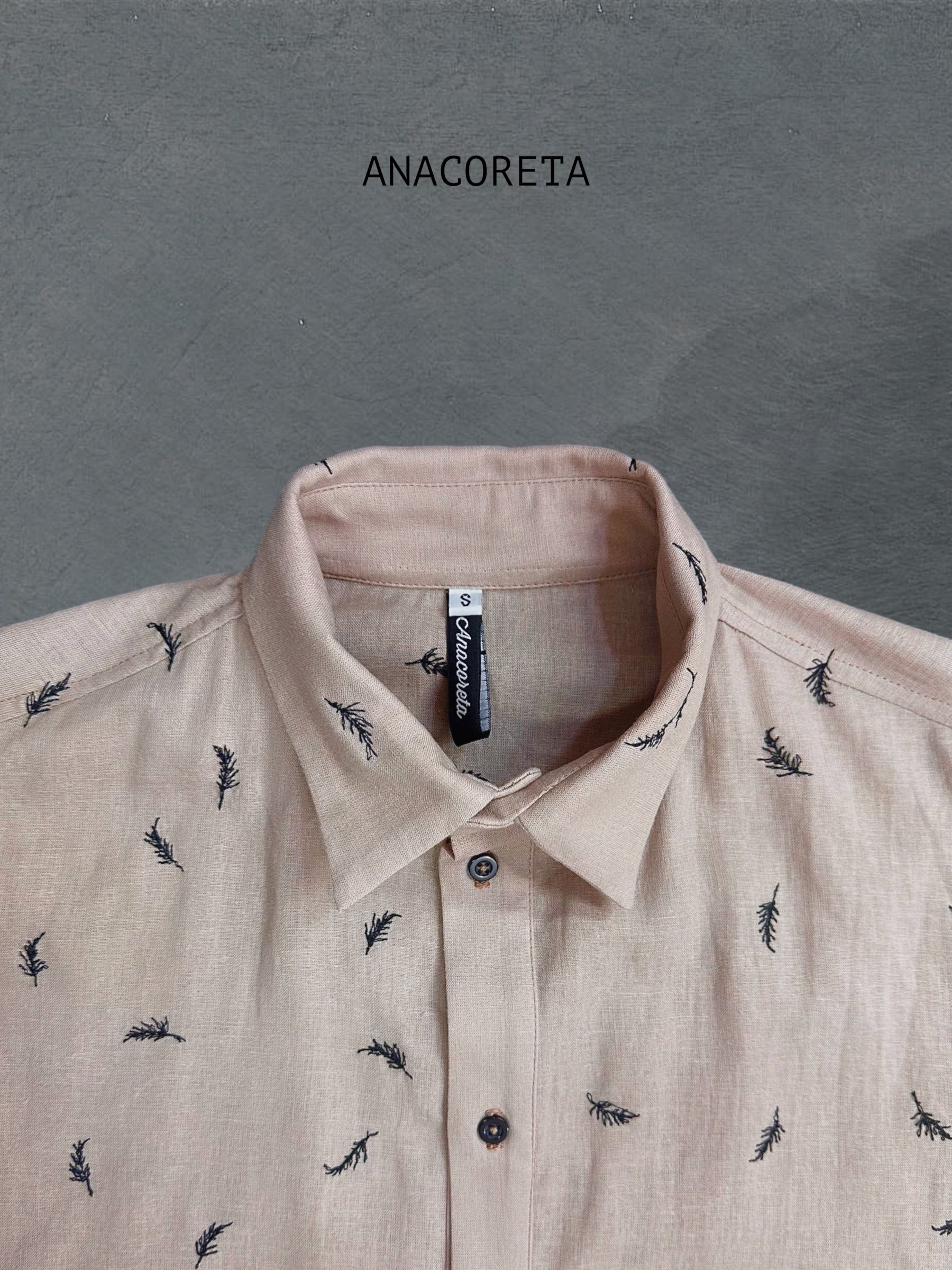 Camisa de lino/algodón bordada a mano con motivos de plumas de ave. Cada pluma se hace a mano sobre el lienzo, dando como resultado una prenda única cuyos motivos no se repiten jamás.