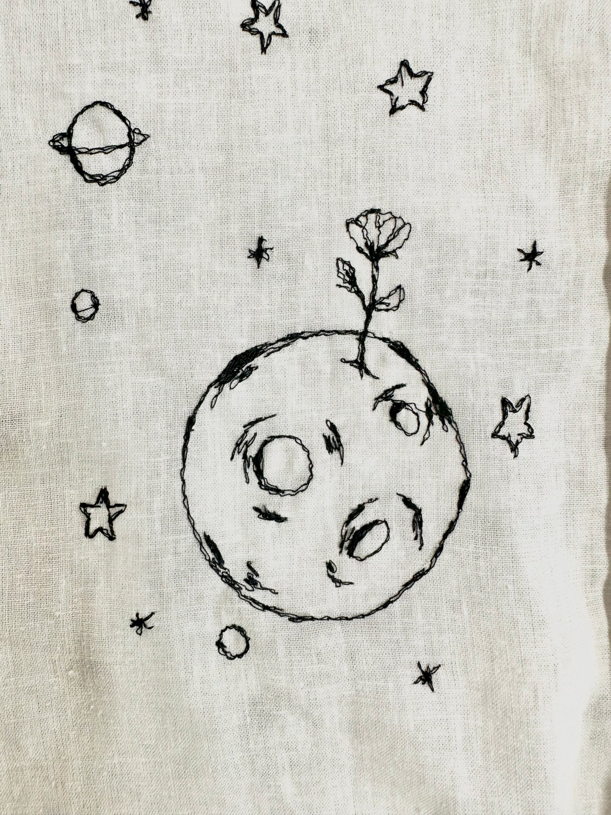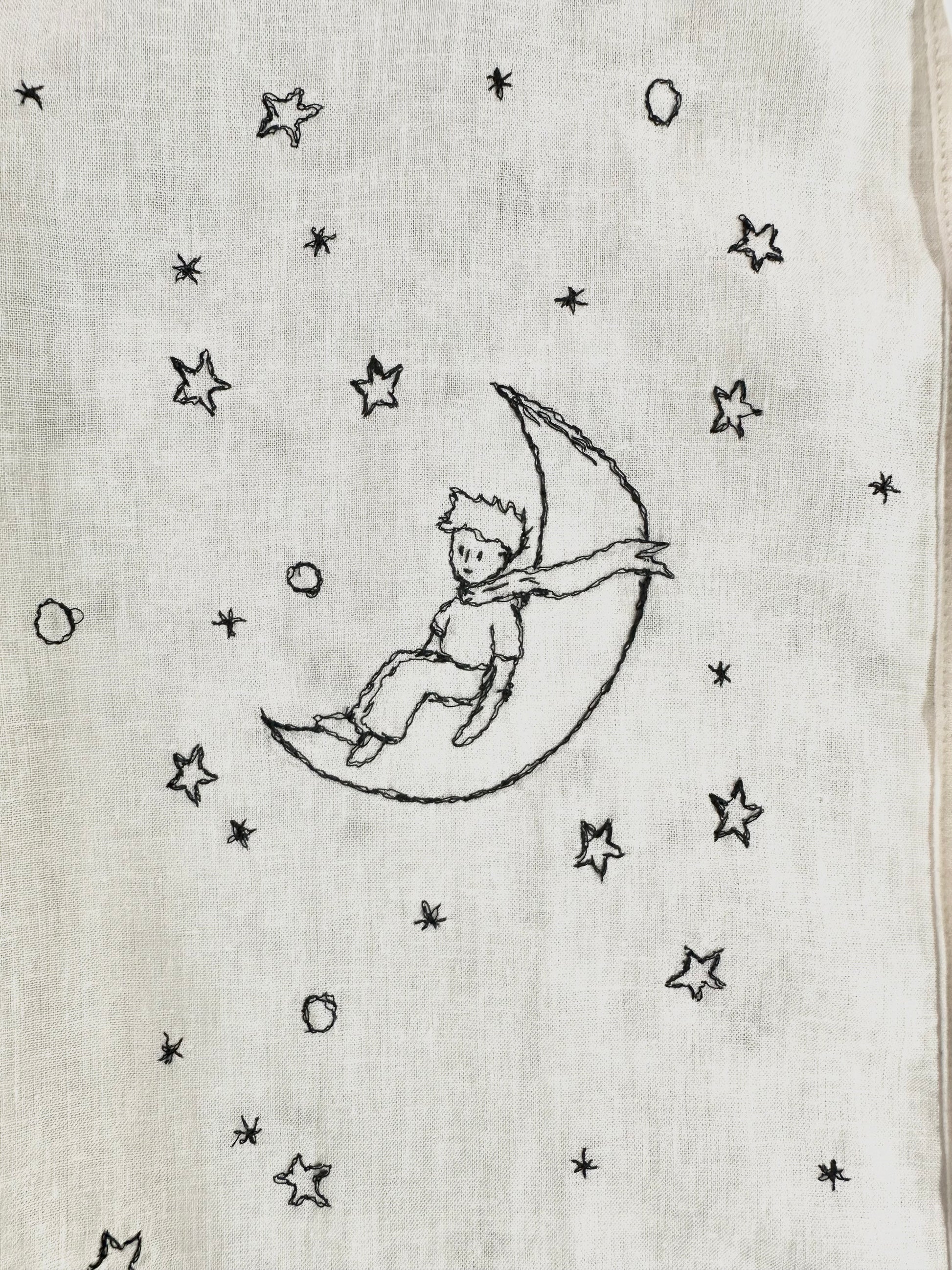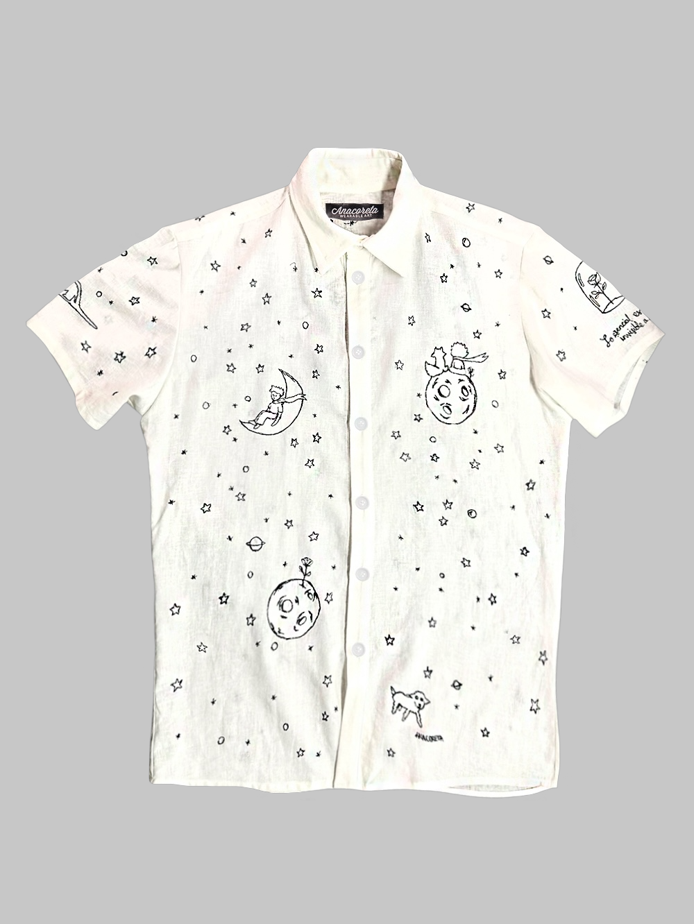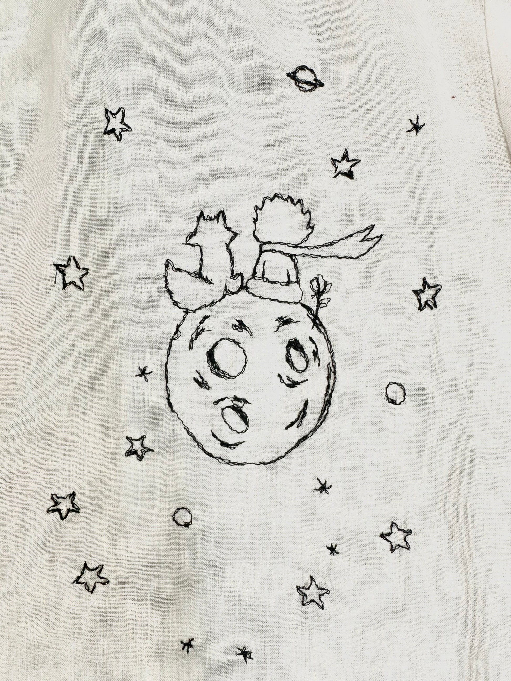 Camisa de lino/algodón bordada a mano con motivos del principito. Cada bordado se hace a mano sobre el lienzo, dando como resultado una prenda única cuyos motivos no se repiten jamás, pero siempre con la garantía de calidad de nuestro trabajo artístico.
