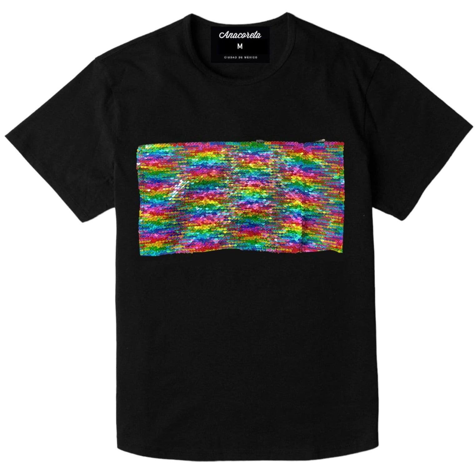 Tee 100% algodón peinado con aplicaciones de lentejuelas reversibles en el pecho.